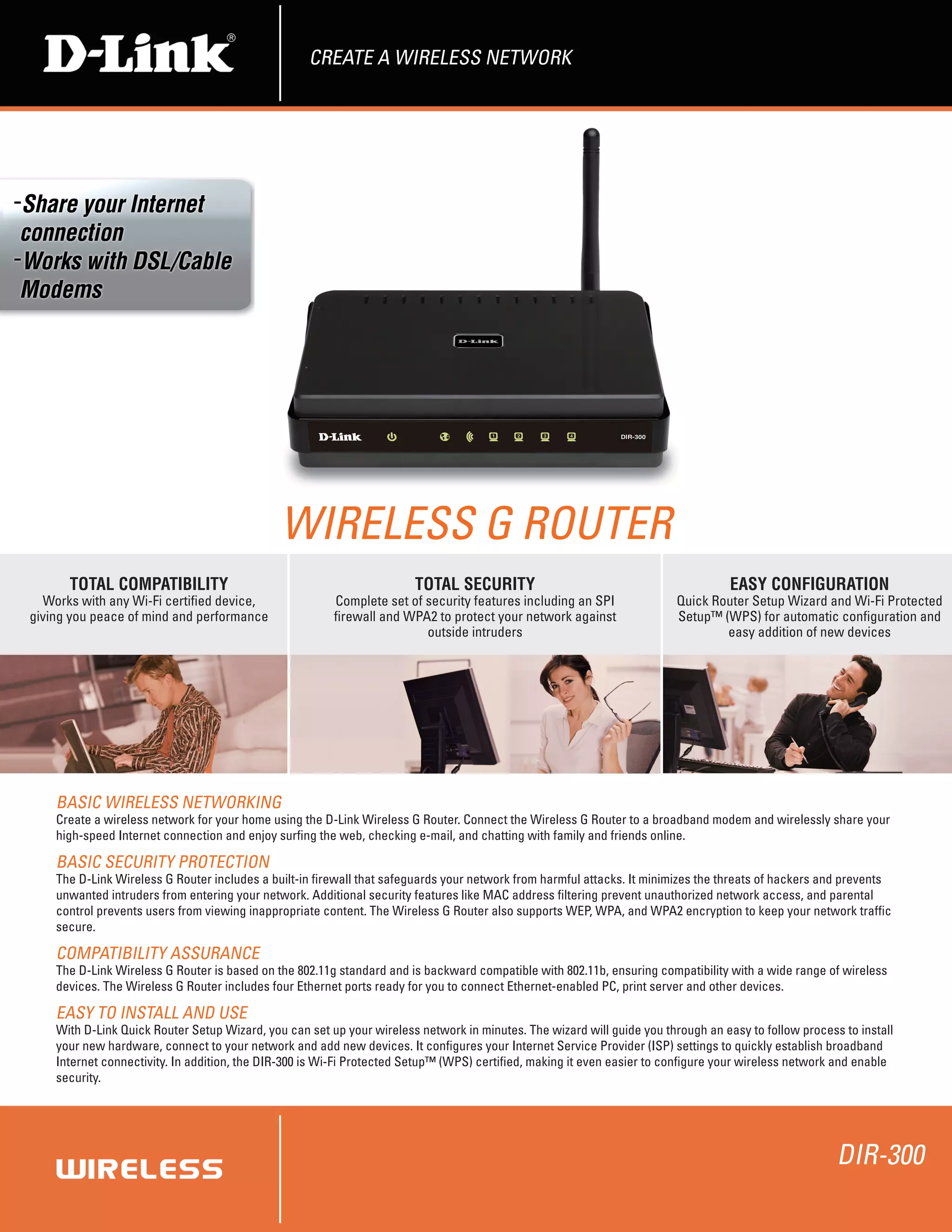 The document describes the D-Link Wireless G Router, which allows users to create a wireless network in their home. It connects to a broadband modem to share an internet connection wirelessly. Setup is easy using the Quick Router Setup Wizard. The router provides security features like WPA/WPA2 encryption and a firewall to protect the network from threats. It is compatible with many wireless devices and supports multiple computers and devices on the network through its four Ethernet ports.