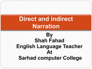 The document explains the concepts of direct and indirect narration in English, including definitions, examples, and rules for conversion. It outlines changes necessary for pronouns, verb tenses, and sentence structure when reporting speech. Additionally, it provides specific rules for assertive, interrogative, and other sentence types in both direct and indirect forms.