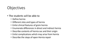 The document is a comprehensive overview of direct and indirect inguinal hernias, detailing their definitions, clinical features, and differences, along with associated complications. It describes the anatomy involved, types of hernia repairs, and surgical techniques such as Bassini and laparoscopic approaches. The objective is to educate students on understanding and managing inguinal hernias effectively.