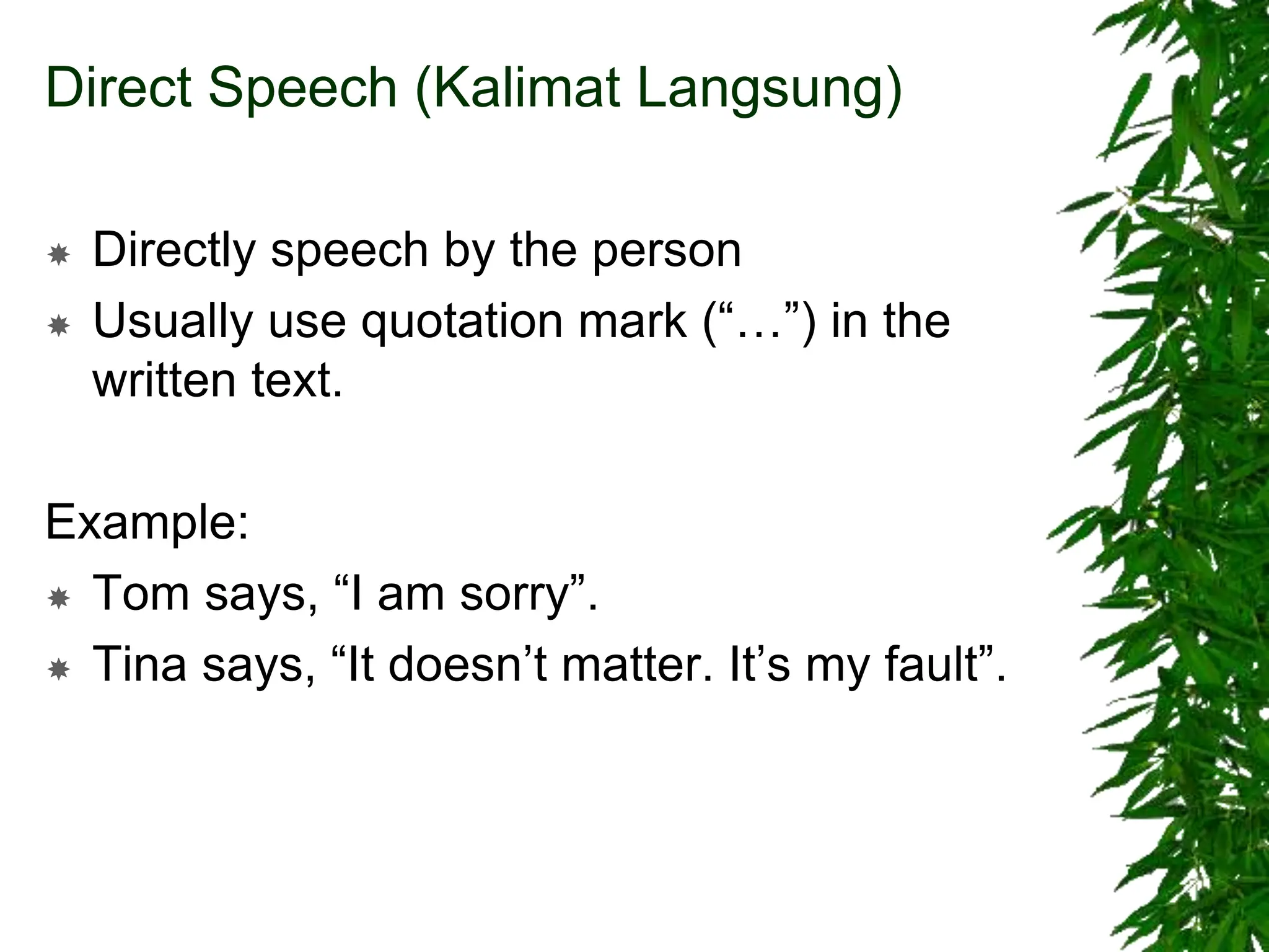 The document explains the difference between direct and indirect speech, detailing how to convert direct quotes into reported speech. It outlines rules for commands, statements, and questions, including tense changes and the use of conjunctions. Examples are provided to illustrate these concepts clearly.