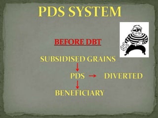 This document summarizes a study on direct benefit transfers in India. It explains that direct benefit transfer is a scheme launched in 2013 to directly transfer government benefits to citizens' bank accounts in order to reduce corruption and inefficiencies. However, it faces challenges in identifying beneficiaries as only 40% of Indians have bank accounts and the identification system relies on Aadhaar numbers, of which only half of citizens currently have. It also notes that expanding banking access and updating beneficiary lists are major hurdles to implementing the direct benefit transfer scheme nationwide.