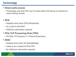 This document discusses techniques for improving CPU access to data from IO devices, including Direct Cache Access (DCA), PCIe Transaction Layer Processing Hints (TPH), and Data Direct I/O (DDIO). DCA allows the CPU to access cache data from IO devices to avoid memory access, but requires driver intervention. PCIe TPH and DDIO aim to prefetch or retain IO write data in the cache without driver involvement. DDIO is specific to Intel platforms and accelerates local socket performance, while DCA does not differentiate sockets. The document provides details on how each technique functions and references further reading.