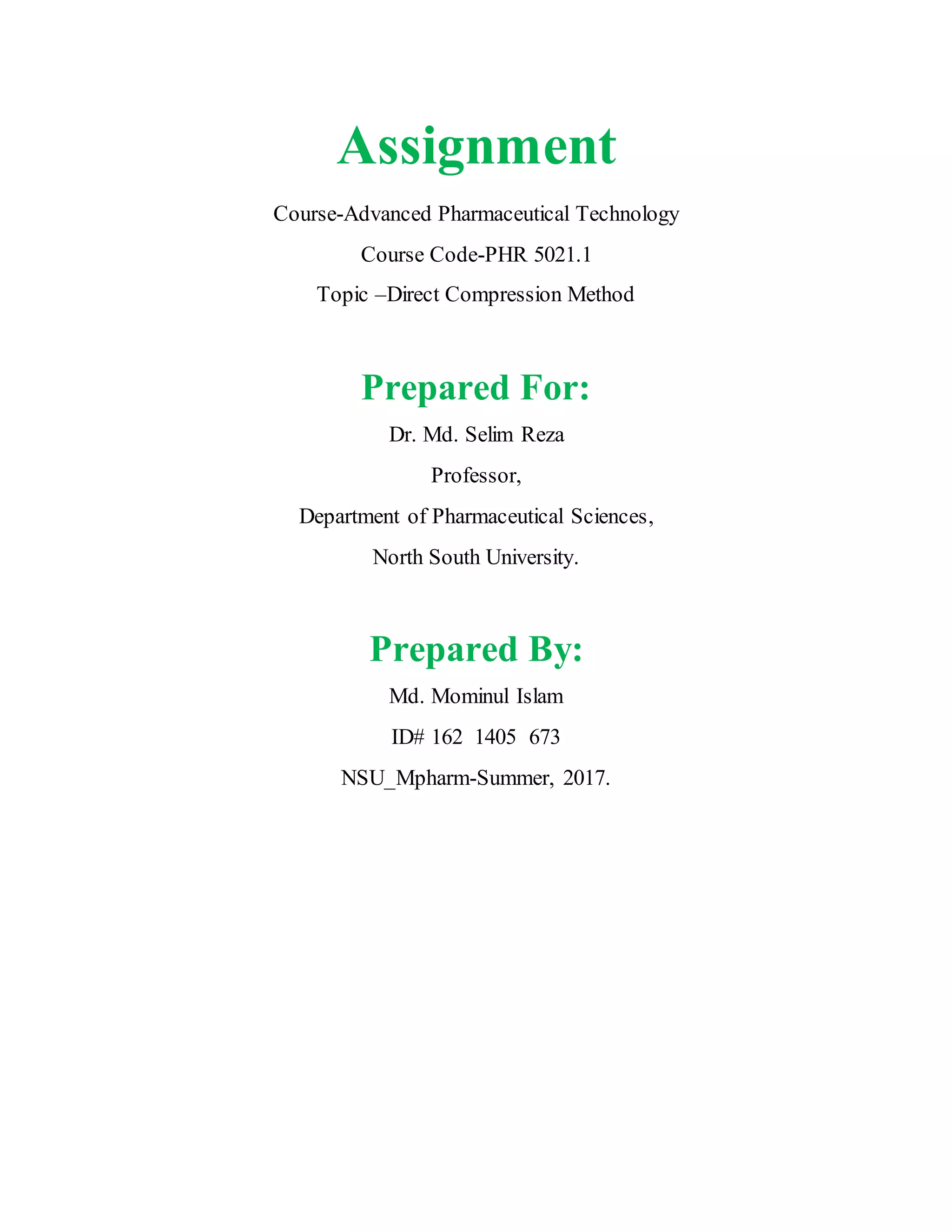 The document discusses the direct compression method in tablet manufacturing, emphasizing its efficiency and simplicity compared to traditional granulation methods. It highlights the critical selection of excipients for successful direct compression, addressing challenges related to API compressibility and uniformity. The advantages of this method include reduced processing time and costs, along with increased product stability, while also acknowledging its limitations and the importance of excipient properties.