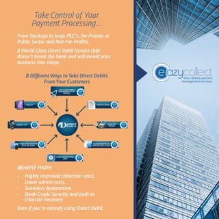 Eazy Collect offers a comprehensive direct debit service that caters to various business sizes, providing benefits like improved collection rates, lower admin costs, and seamless automation. The service is cloud-based, FCA regulated, and includes features like advanced notice communications and customizable payment collection dates. Clients can quickly set up direct debits within 48 hours, with dedicated customer support available.