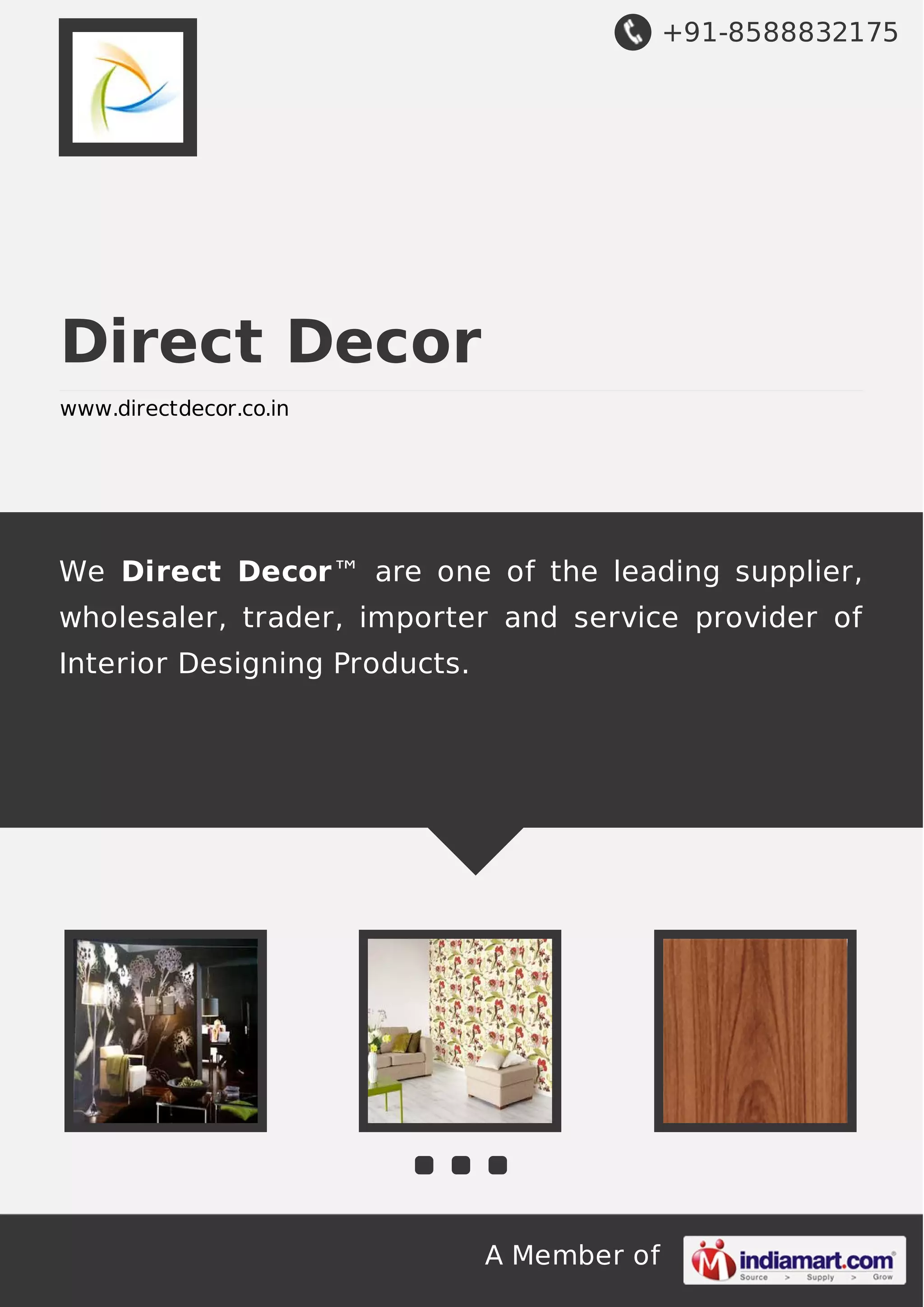 Direct Decor is a leading supplier of interior design products in Mumbai, India. Established in 2011, it supplies, wholesales, trades, and imports interior design products and provides services. Direct Decor designs interior spaces for both residential and commercial clients while considering functionality, comfort and budget. It has experience executing projects including shops, showrooms, cafes, airports and offices in Mumbai. The company offers a wide range of flooring, wallpaper, and other interior products.