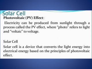 The document discusses direct energy conversion technologies, focusing on photovoltaic cells and fuel cells. Photovoltaic cells convert solar energy into electrical power for applications like water pumping, commercial lighting, and residential power. Fuel cells generate electricity through chemical reactions using hydrogen and oxygen, offering a non-polluting power source, though they face challenges like higher initial costs and difficulties in fuel handling.