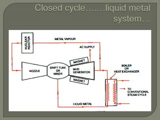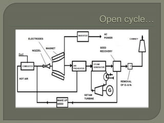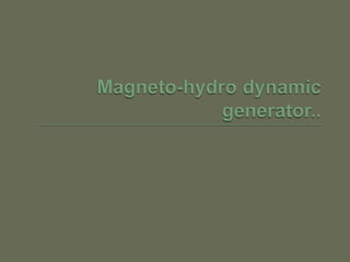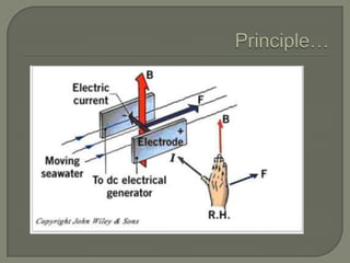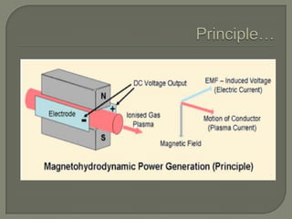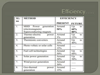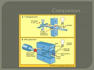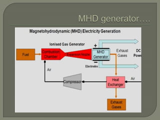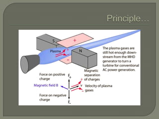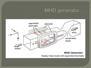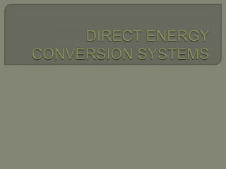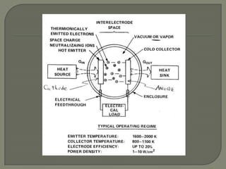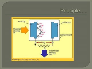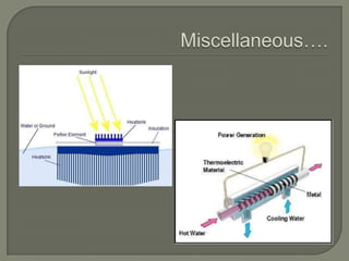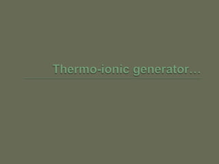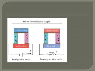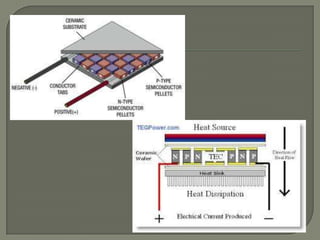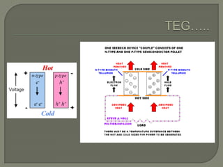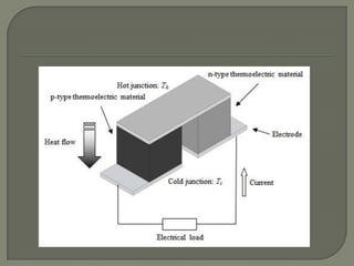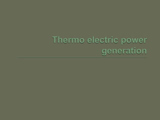 The document discusses thermoelectric power generation. It describes how Seebeck discovered that a temperature difference across two dissimilar conductors produces a voltage (Seebeck effect), which is the operating principle of thermoelectric generators. A thermoelectric generator uses semiconductor materials like bismuth telluride that convert heat into electricity through the Seebeck effect. When heat is applied to one side of the semiconductor couple, electrons move from the hot side to the cold side, producing a current proportional to the temperature difference across the couple.