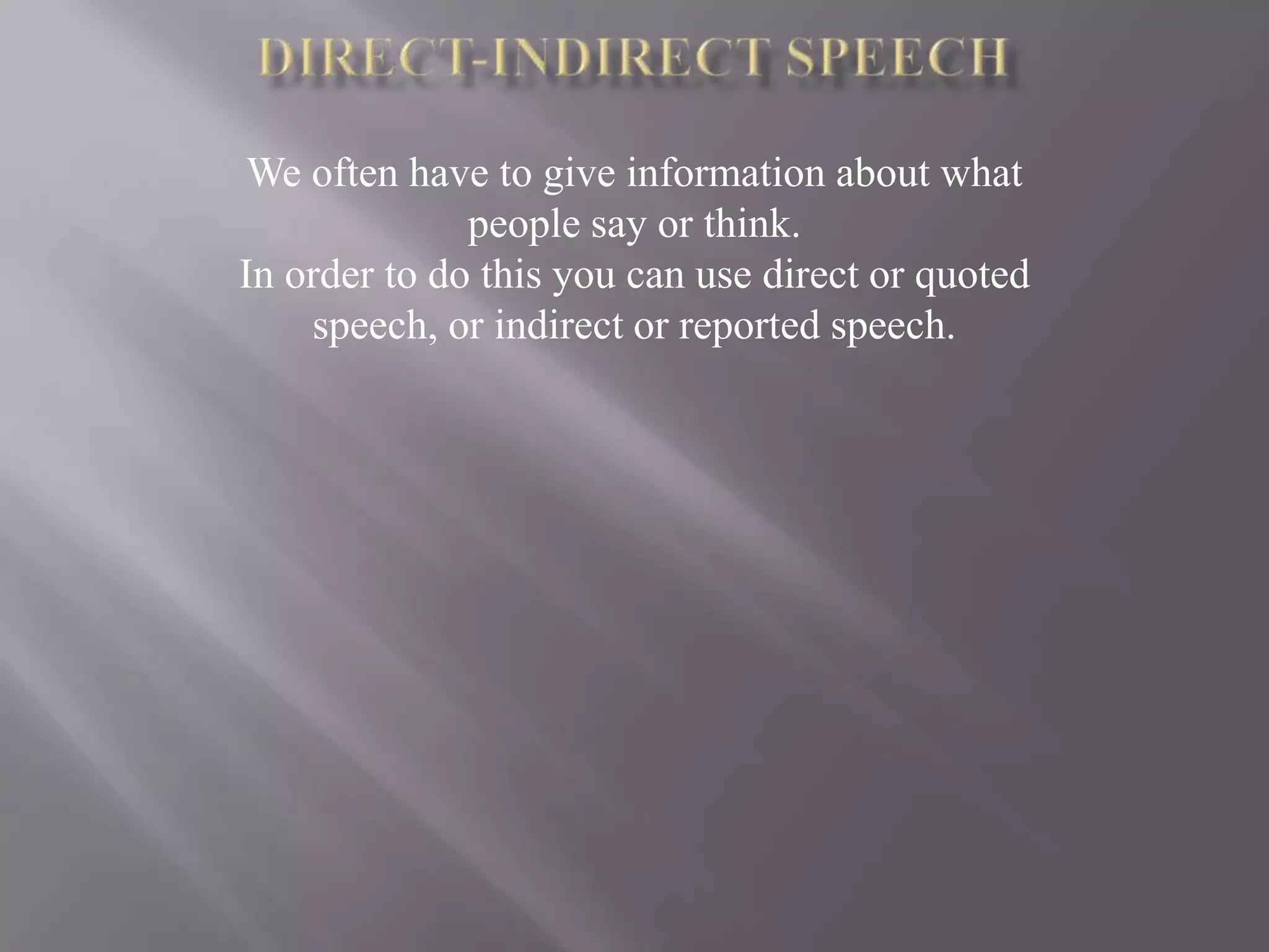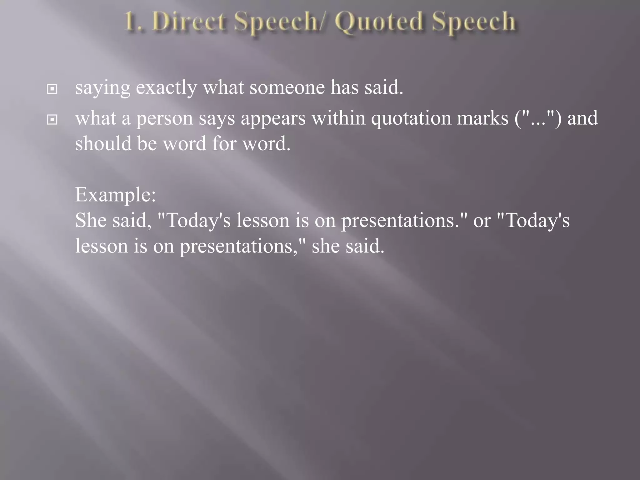 This document discusses direct (quoted) speech versus indirect (reported) speech. It notes that direct speech uses quotation marks to report exact words, while indirect speech does not use quotation marks and usually changes verb tenses and pronouns to reflect the current tense. It provides examples of changing direct speech to indirect speech by altering verb tenses, pronouns, and time words or signifiers.