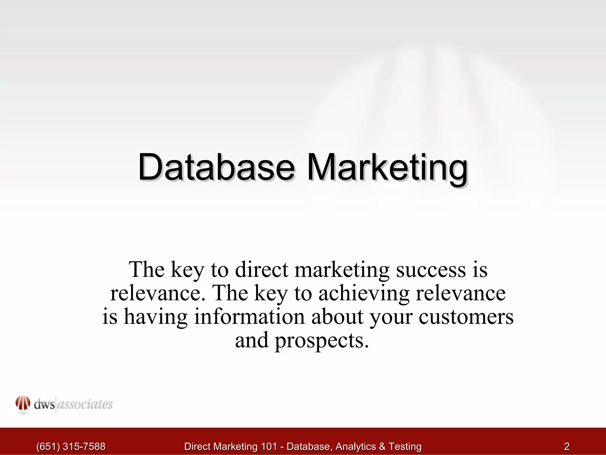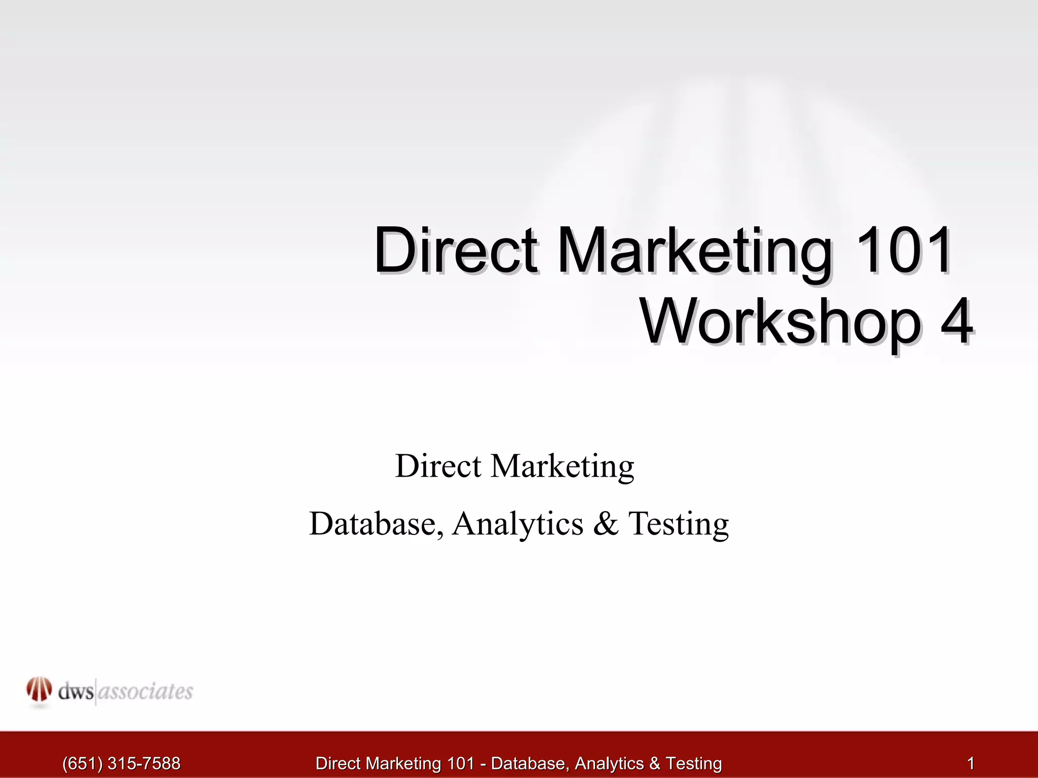 The document outlines a workshop on direct marketing focusing on database marketing, analytics, and testing strategies. It emphasizes the importance of targeted marketing through comprehensive customer databases, relevant communication, and campaign evaluation metrics to enhance marketing efficiency and customer relationships. Additionally, it covers the fundamentals of testing marketing strategies and analyzing campaign profitability to maximize return on investment.