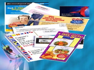 Direct marketing is an interactive marketing system that uses advertising media to elicit a measurable response. It is characterized by personalization, response mechanisms, transaction capabilities, databases, and measurable responses. Direct marketing allows for quicker sales, better targeting of customers, tailored messages, relationship building, and enhanced profits. Common direct marketing media include direct mail, telemarketing, email, and catalogs. Product placement in films is a form of direct marketing where branded goods are featured in movies and television shows without overt advertising.