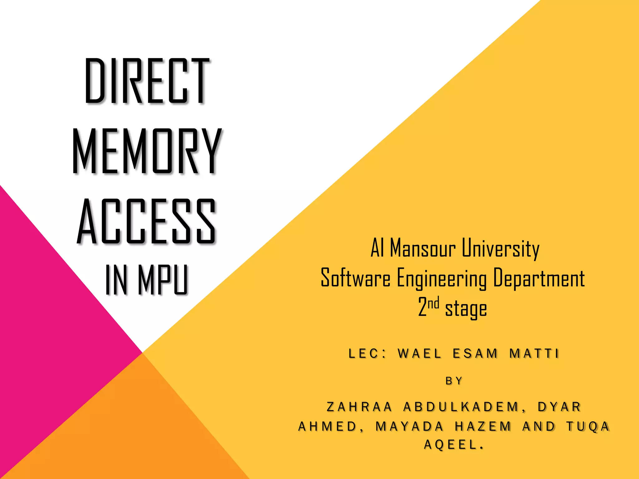 DIRECT MEMORY ACCESSIN MPU E DI T E D B Y T U Q A A Q E E L R e s e a r c h e r s : Z a h r a a A b d u l k a d e m , M a y a d a H a z e m , D y i a r A h m e d a n d T u q a A q e e l . L e c : Wa e l E s a m M a t t i Al Mansour University Software Engineering Department 2nd stage