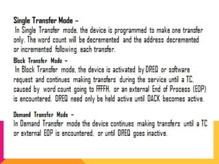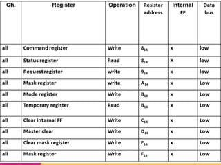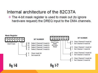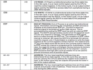THE 8237 DMACONTROLLER The 8237 supplies memory & I/O with control signals and memory address information during the DMA transfer. actually a special-purpose microprocessor whose job is high-speed data transfer between memory and I/O Figure 1–3 shows block diagram of the 8237 programmable DMA controller 8237 is not a discrete component in modern microprocessor-based systems. it appears within many system controller chip sets 8237 is a four-channel device compatible with 8086/8088, adequate for small systems. expandable to any number of DMA channel inputs 8237 is capable of DMA transfers at rates up to 1.6M bytes per second. each channel is capable of addressing a full 64K-byte section of memory and transfer up to 64K bytes with a single programming