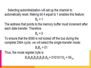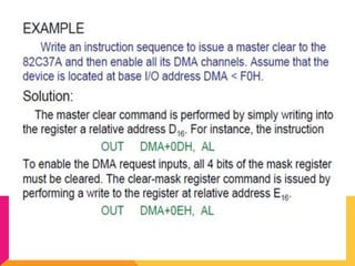 Example (2) : Writethe 1234 h into the base address register and the current register for channel 0 of DMA controller located at base I/O address DMA? Sol:- MOV AL,34H ; WRITE LOW BYTE OUT DMA +0, AL MOV AL,12H ; WRITE THE HIGT BYTE OUT DMA +0, AL Example (1) : Write 0FFF H into the base and current count registers for channel 1 of DMA located at address DMA ? Sol:- MOV AL,0FFH ; WRITE LOW BYTE OUT DMA +3, AL MOV AL,0FH ; WRITE THE HIGT BYTE OUT DMA +3, AL