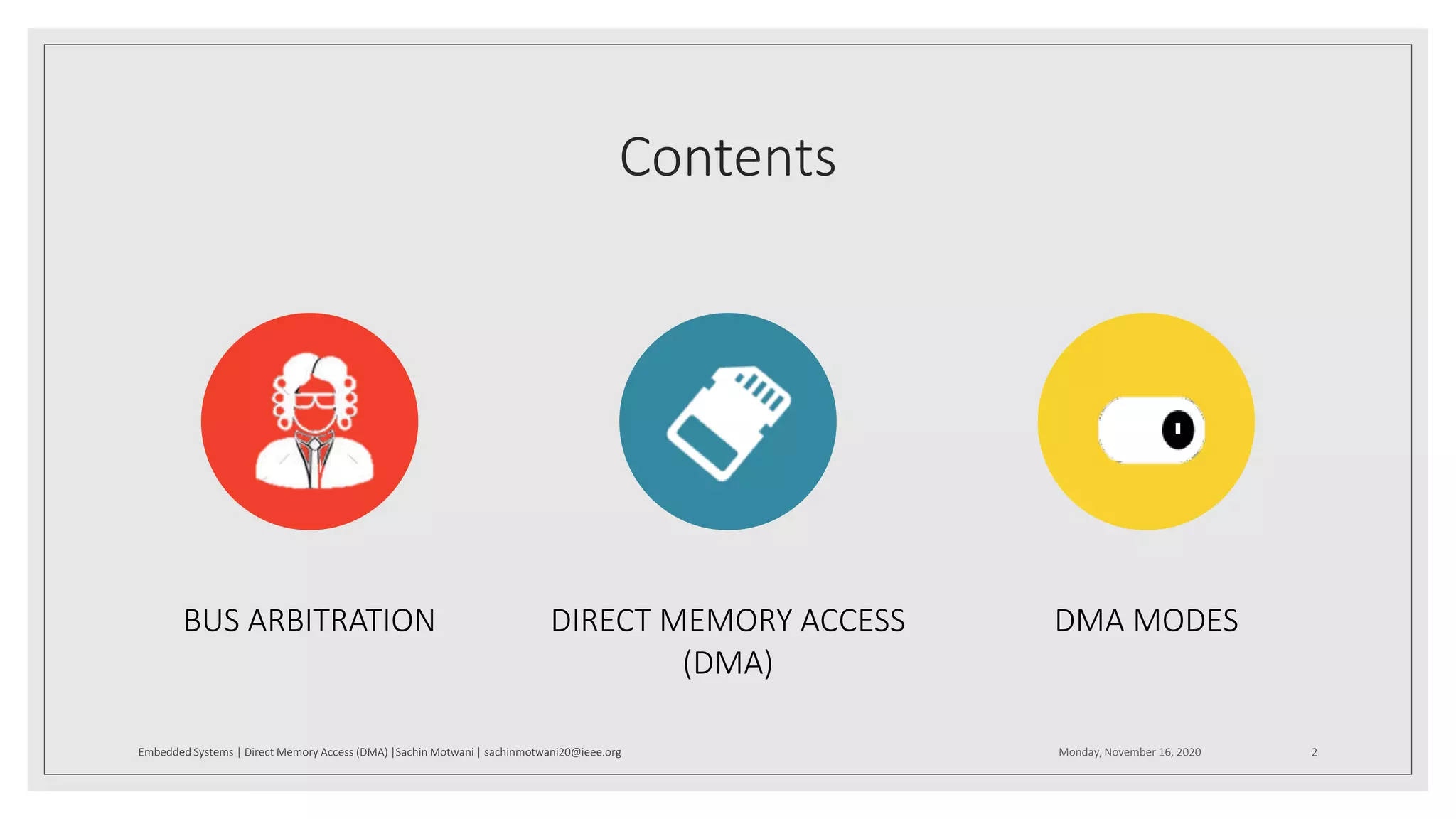 The document provides an overview of Direct Memory Access (DMA), explaining its function and significance in embedded systems. It describes DMA as a method that enables data transfer from peripherals to memory without CPU involvement, thus eliminating interrupt latency. The document also outlines three DMA modes: burst mode, cycle stealing mode, and transparent mode.