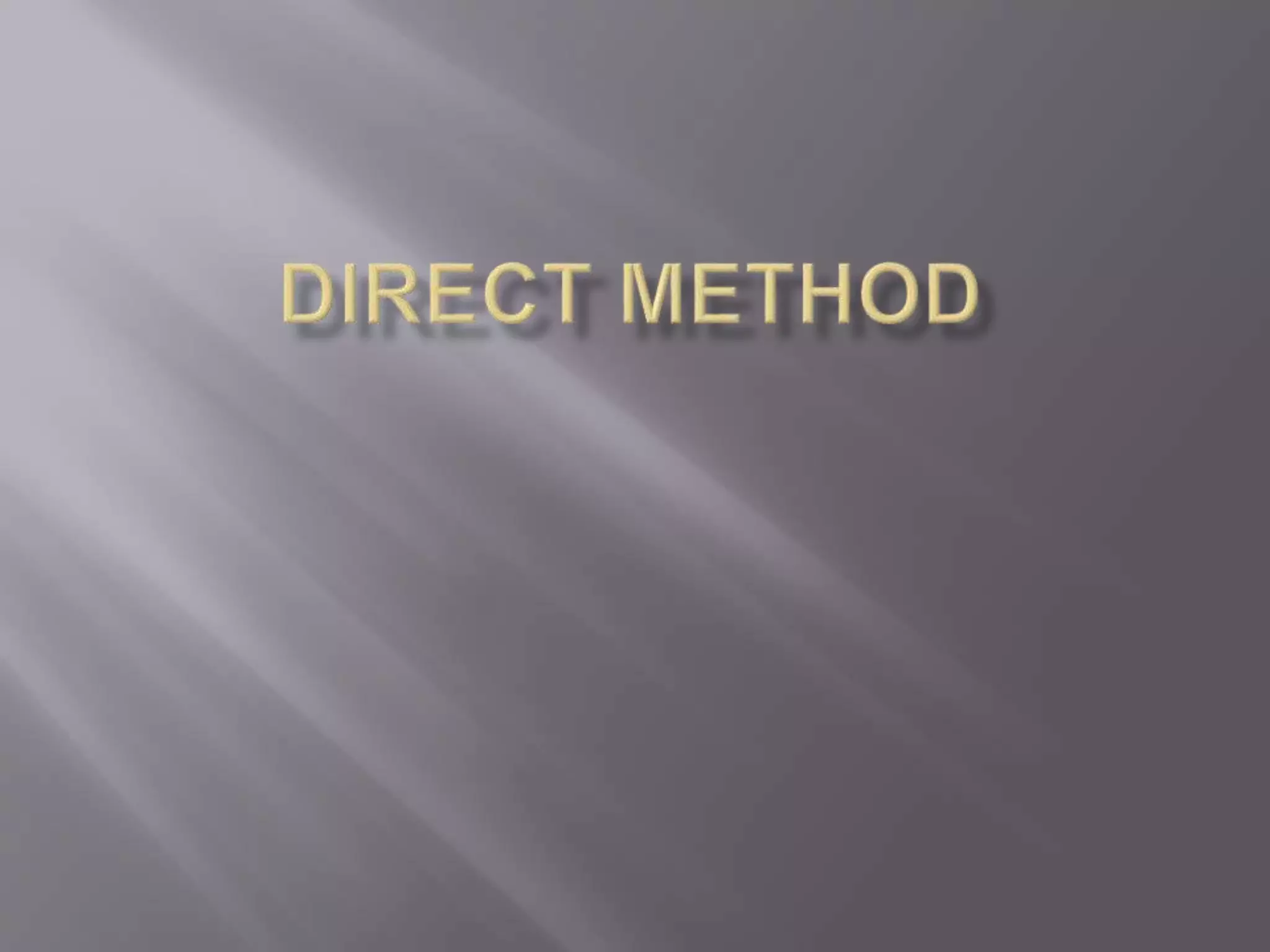 The direct method of teaching a foreign language refrains from using the learner's native language and uses only the target language. Developed around 1900 in Germany and France, it aims to teach a second language similarly to acquiring a first language. The direct method consists of five parts: showing vocabulary using realia or gestures, saying words and sentences, having students try repetitions, correcting pronunciation, and repeating words. While it effectively teaches the language itself, its assumptions about second language acquisition have been criticized, and public schools found it difficult to implement due to constraints.