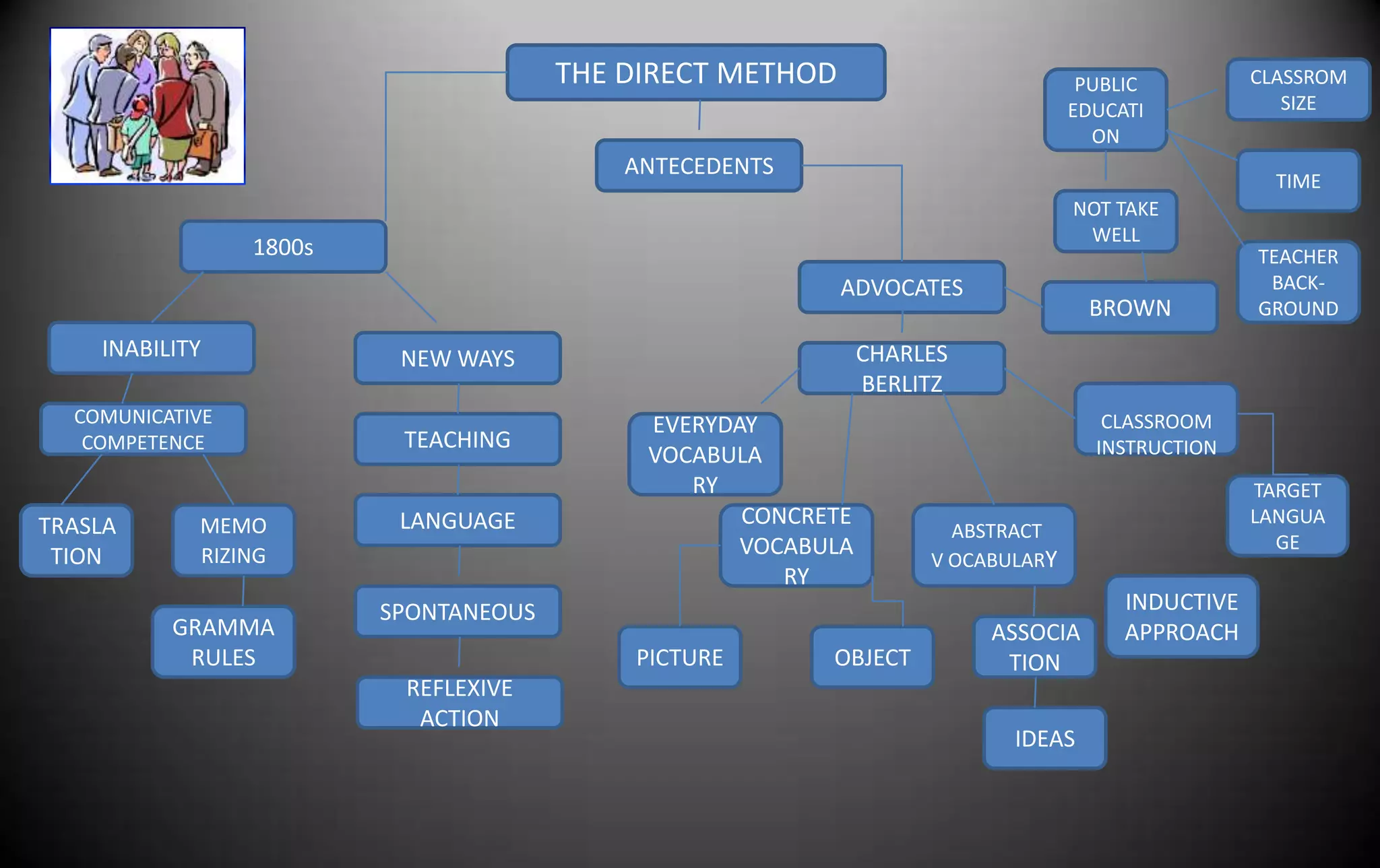 The direct method teaches language through immersion and focuses on oral communication skills in the target language. It uses everyday vocabulary, pictures, and realia to introduce concrete concepts before abstract ideas. Classroom instruction is conducted entirely in the target language to help students learn to think and communicate spontaneously through modeling, practice, and inductive discovery of grammar rules. Typical techniques include reading aloud, question-answer exercises, self-correction, conversations, fill-in-the-blank, dictation, and paragraph writing.