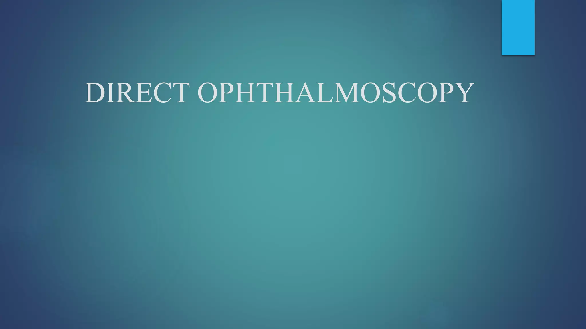 1. Direct ophthalmoscopy allows for a magnified but erect virtual image of the fundus using a light source and lenses.