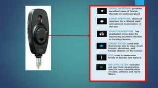 3. The examiner holds the ophthalmoscope and looks through the lens while adjusting focus to examine the different structures of the eye from the anterior segment to the fundus.