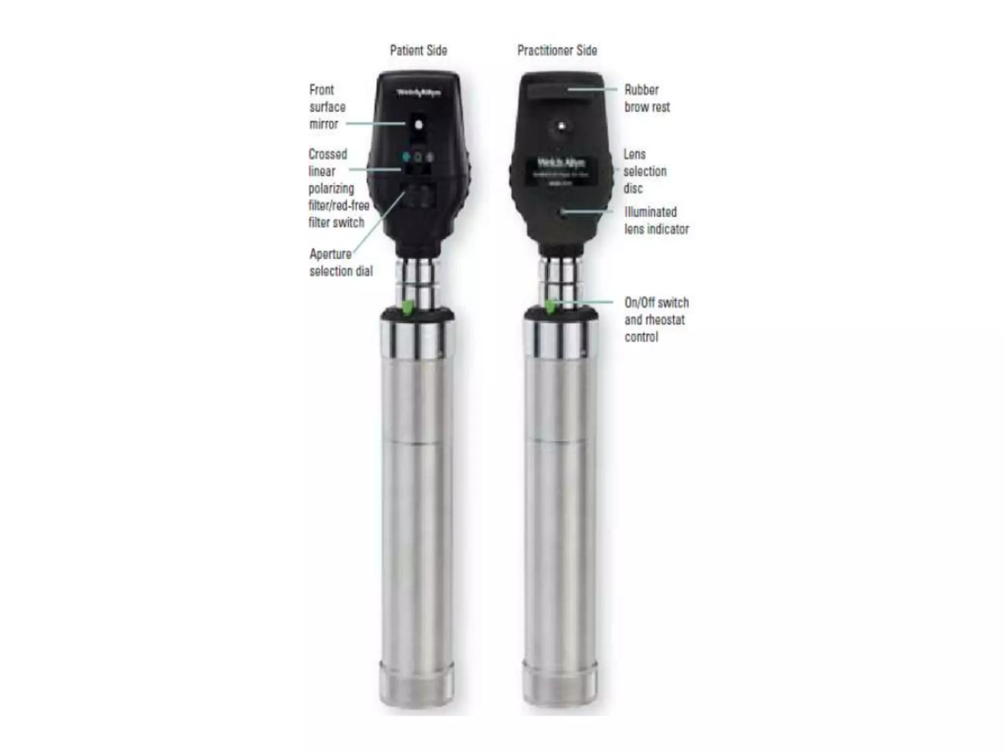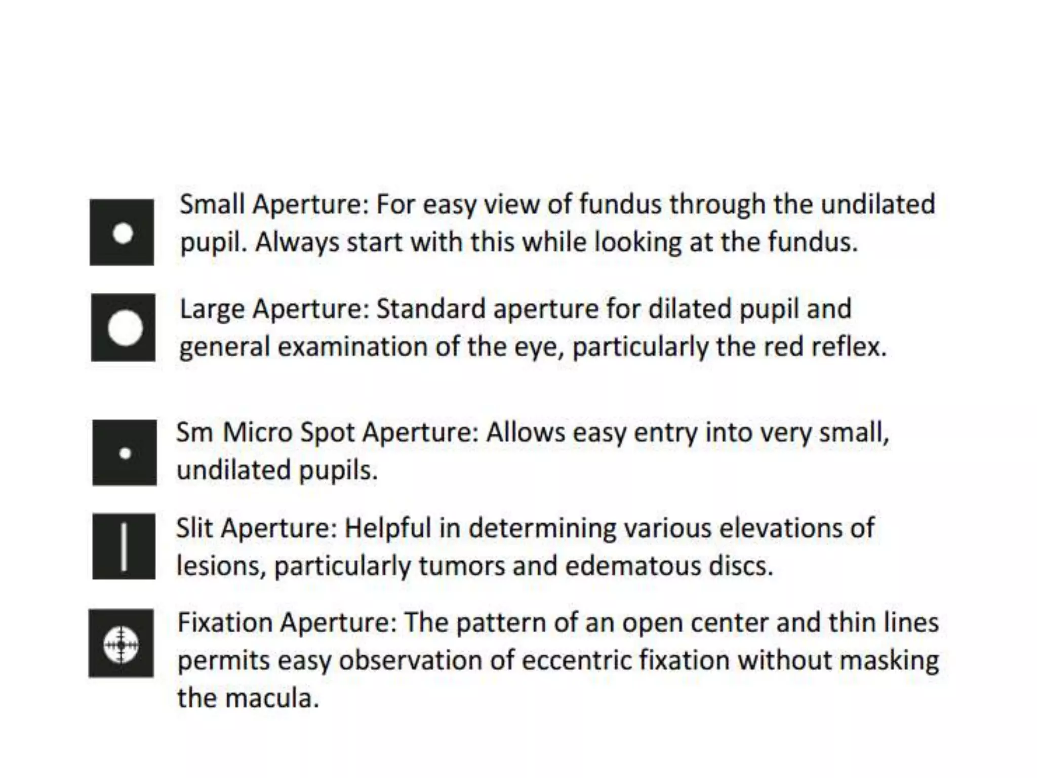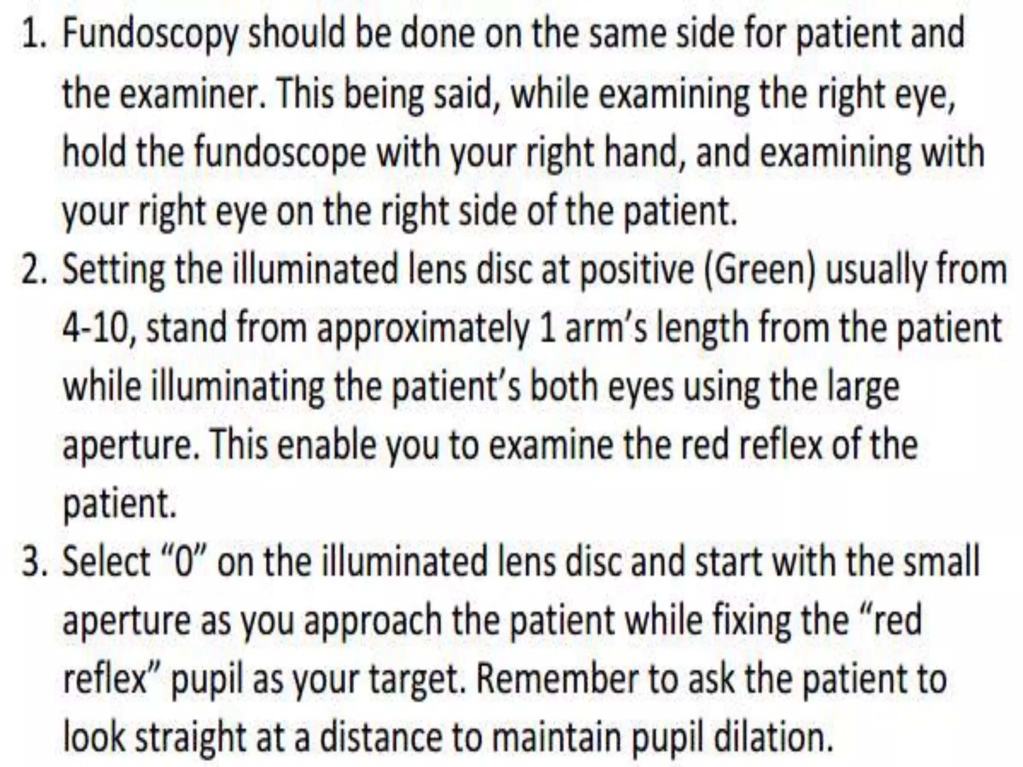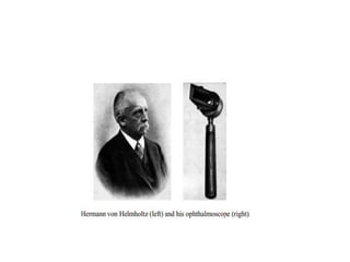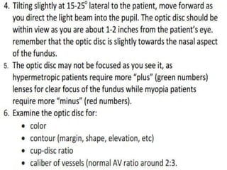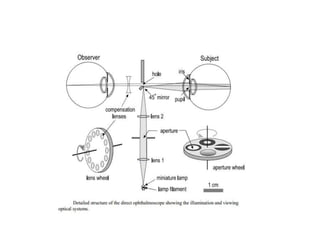 2. Key aspects covered include how the examiner is able to view the retina by aligning their eye with the light source entering the patient's eye, and modern ophthalmoscopes using mirrors to reflect light at a 90 degree angle.