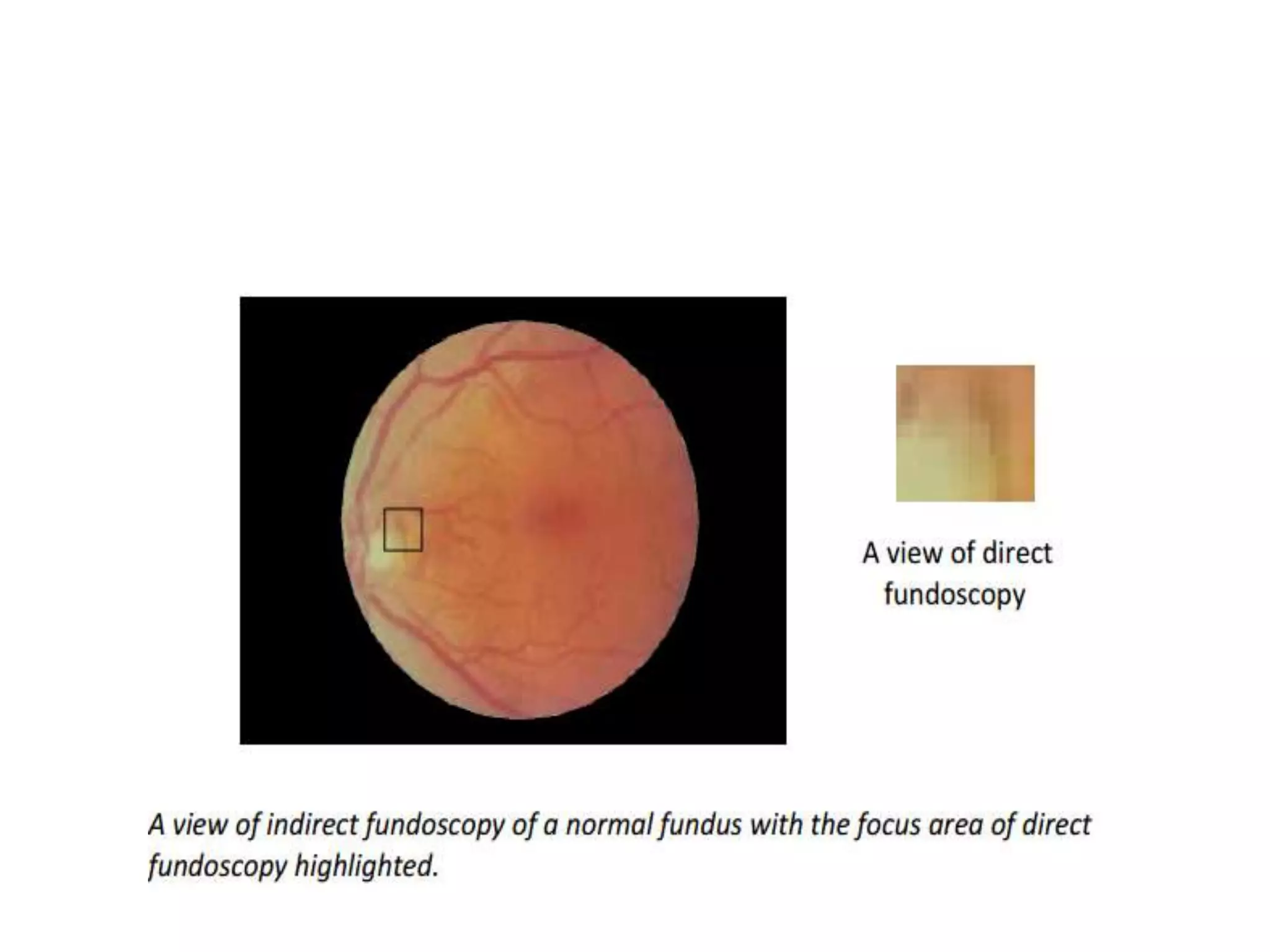1. The document describes the technique of direct ophthalmoscopy, providing details on its history, modern instrumentation, use, and what can be observed through examination of the retina.
