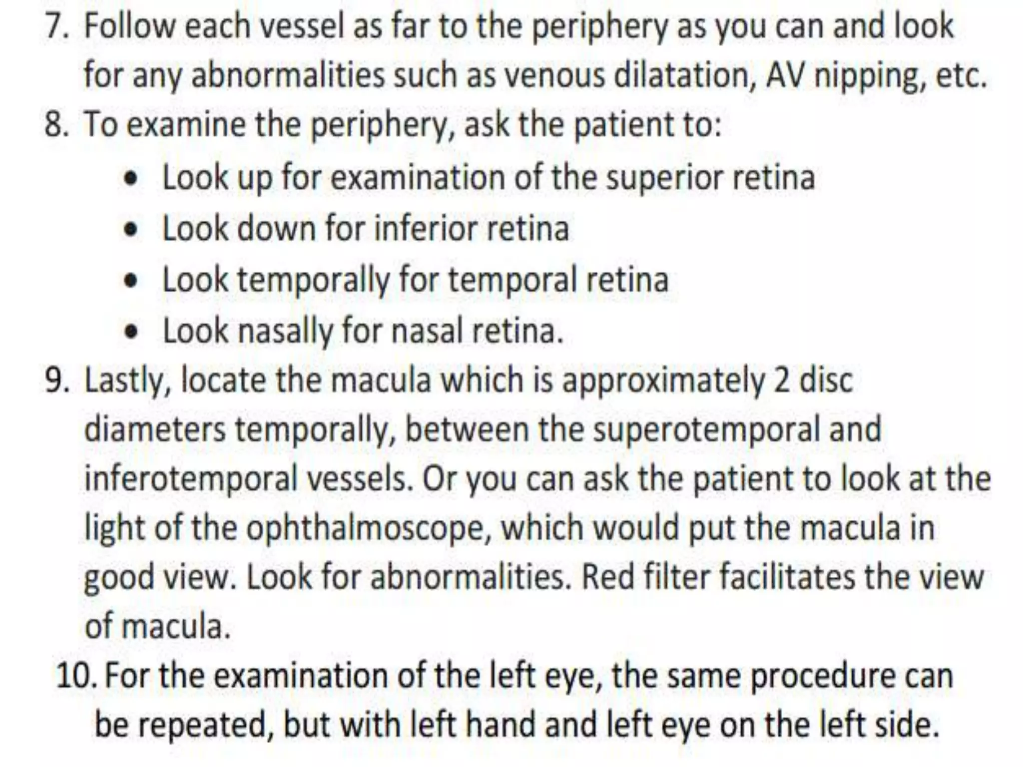 3. The summary also notes what can be seen through direct ophthalmoscopy like the optic disc, macula, blood vessels, and various pathological features.
