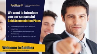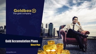 This document describes Goldbex's gold accumulation plans called Direct Plans (DP). It outlines four DP plans (DP100, DP300, DP500, DP1000) that allow customers to purchase gold ingots and earn profits through recommendations. Customers pay 50% upfront and can earn their 50% profit by recommending two new customers or paying the remaining balance. The document provides details on how the plans work, payouts, cycling contracts, and gold repurchase. It encourages people to register and start accumulating gold and profits through Goldbex's accumulation plans.