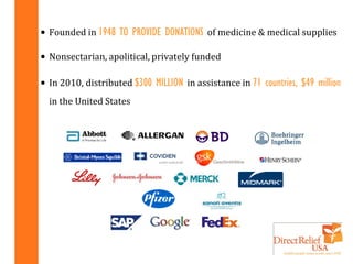 Direct Relief USA, founded in 1948, is a nonsectarian organization providing medical donations and assistance, distributing $300 million in 2010 across 71 countries, including $49 million in the U.S. It focuses on maternal and child health, disease prevention, and strengthening health systems, aiming to enhance access to care for the uninsured and underserved populations. The organization has a network of over 1,000 clinics nationwide and has been pivotal in emergency responses, especially after disasters like Hurricane Katrina.