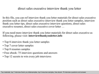 The document provides resources and samples for writing thank you letters after interviews for direct sales executive positions, including tips for personalization and follow-up. It emphasizes the importance of timely communication and the opportunity to make a strong impression by expressing gratitude and reiterating interest in the job. Additionally, it outlines key elements to include in the letter and encourages maintaining good relationships with all contacts involved in the job search.
