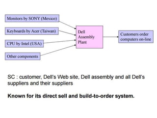 The document discusses Dell's direct-to-customer approach, which bypasses traditional sales channels and focuses on custom order fulfillment, resulting in lower prices and earlier payments. It contrasts 'make and sell' with 'sense and respond' business models, highlighting Dell's strategy of producing goods based on customer demand rather than pre-manufactured inventory. Additionally, it explains the advantages of Dell's model, including flexibility in production and enhanced customer service.