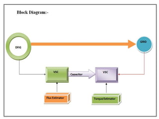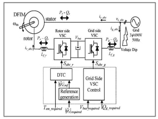 This document proposes a direct torque control strategy for doubly fed induction machine-based wind turbines that can operate under voltage dips without crowbar protection. The control strategy generates a rotor flux amplitude reference to control the torque of the wind turbine and reduce stator and rotor overcurrents during faults. It also provides fast dynamic response. While the control does not eliminate the need for crowbar protection entirely, it can prevent the crowbar from activating during low-depth voltage dips. The direct torque control approach maintains machine connection to the grid and reduces torque oscillations during faults.