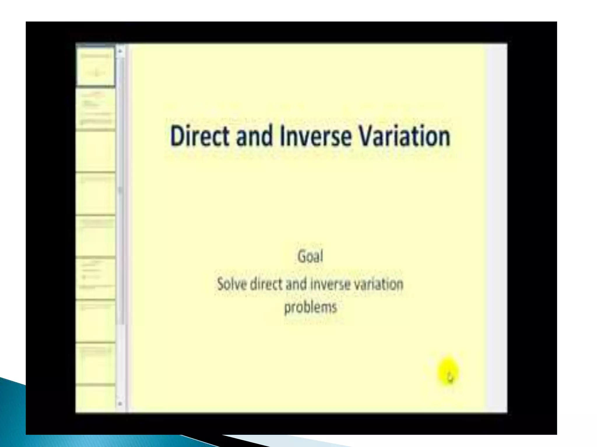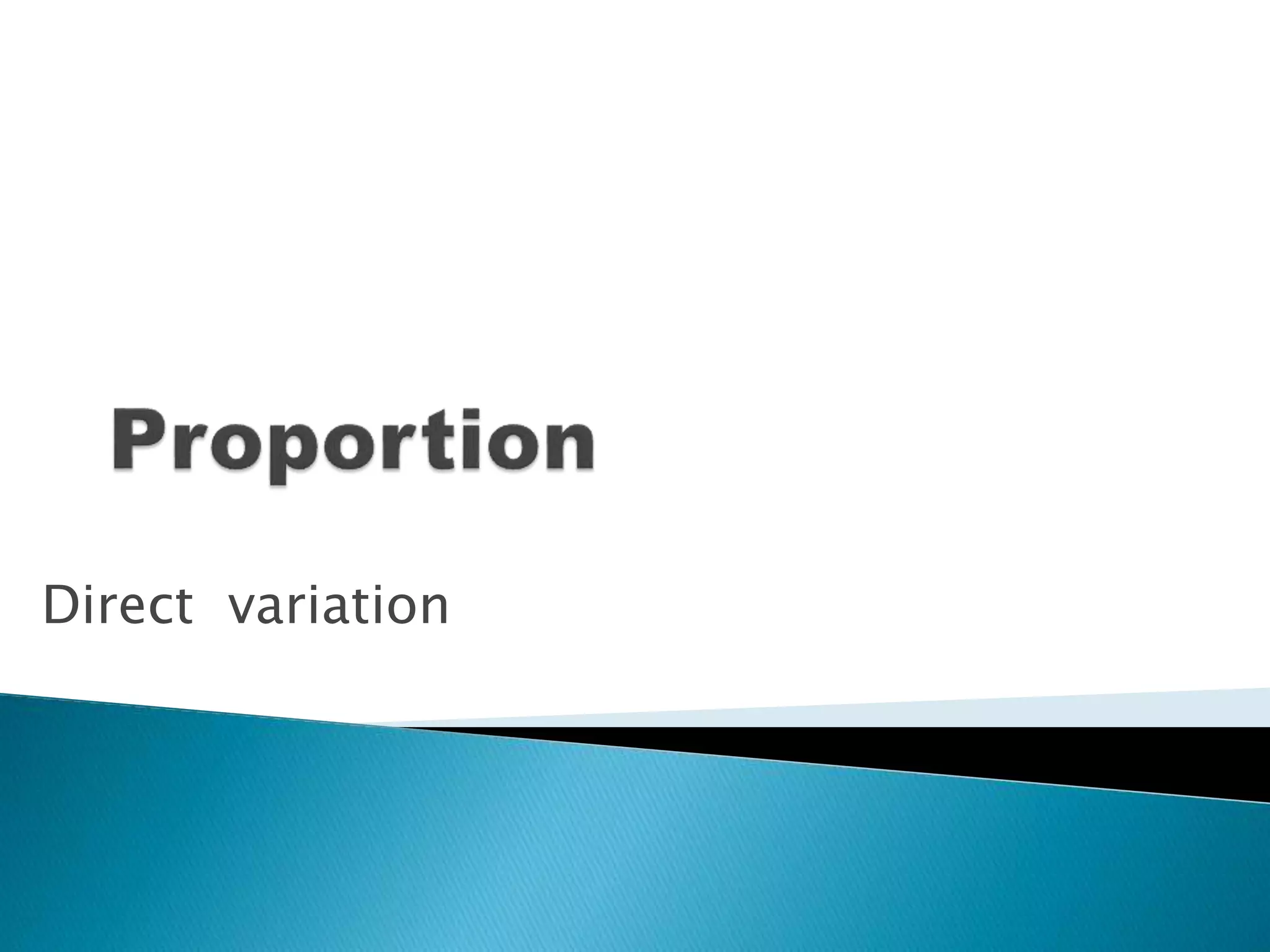 Direct variation describes the relationship between two quantities where they are in a constant ratio. If x is directly proportional to y, their relationship can be written as y = kx, where k is the constant of proportionality. Several examples are provided to demonstrate calculating the constant of proportionality given initial values of x and y, and then using the relationship to find corresponding values of y when given new values of x, and vice versa.