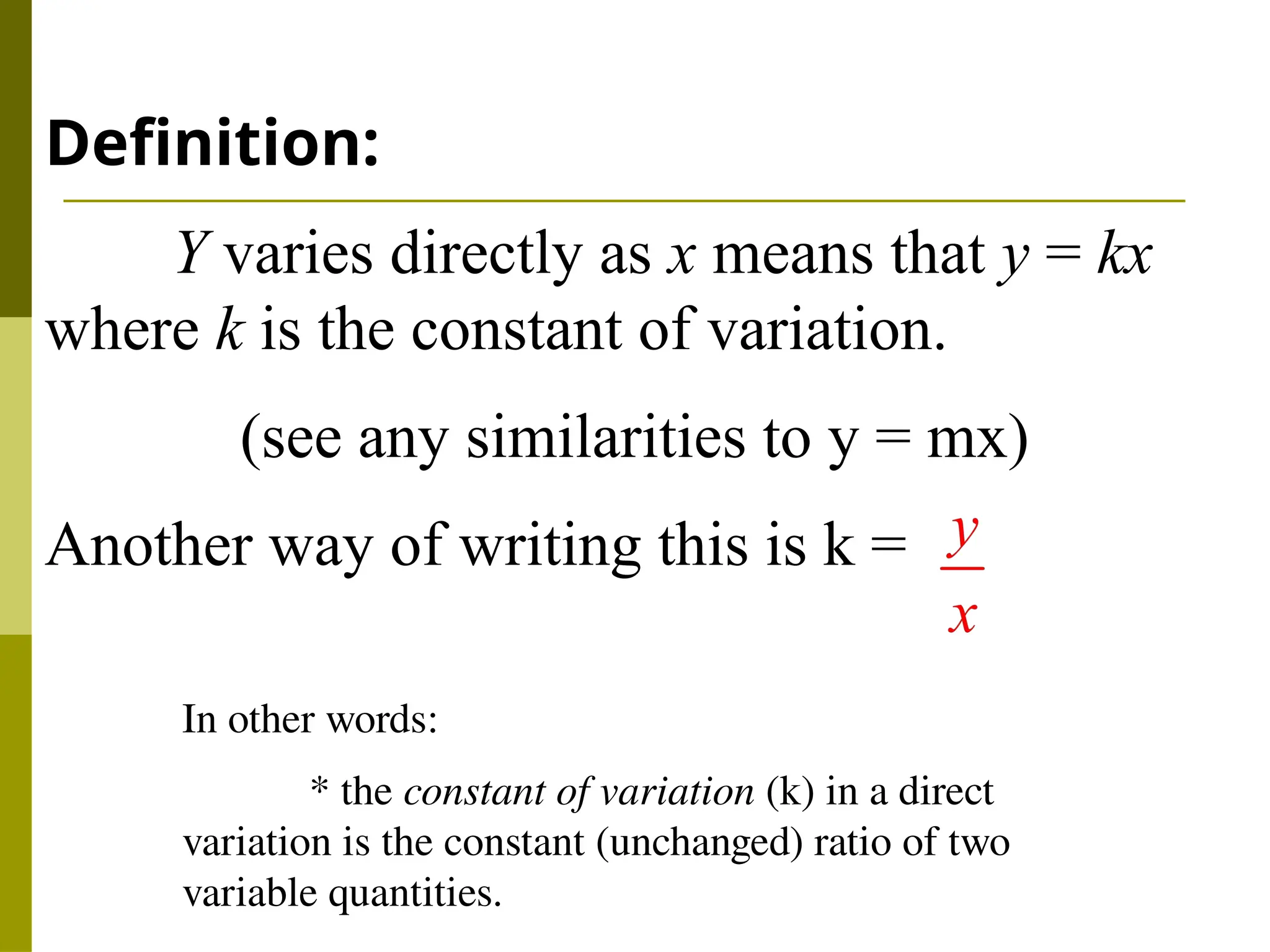 The document explains direct variation, defined by the equation y = kx, where k is the constant of variation. It provides examples of calculating k from various tables of values, solving for unknowns using the consistent ratio, and applying direct variation in word problems. Additionally, it discusses how graphs of direct variation equations always pass through the origin.