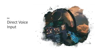 Direct voice input (DVI) allows a single crew member to interface with an aircraft through speech commands in high workload situations. Speech recognition systems have achieved over 95% accuracy rates but decrease to less than 80% under high g-forces. Voice control is not suitable for time-critical systems. DVI has been applied for non-critical tasks like radio tuning and map display but not weapons firing due to response time and recognition problems, especially with similar sounding words. Multi-function displays like Collins Aerospace's MFD-268 provide enhanced situational awareness through high resolution, sunlight readable screens that can display maps, video and more in both landscape and portrait orientations.