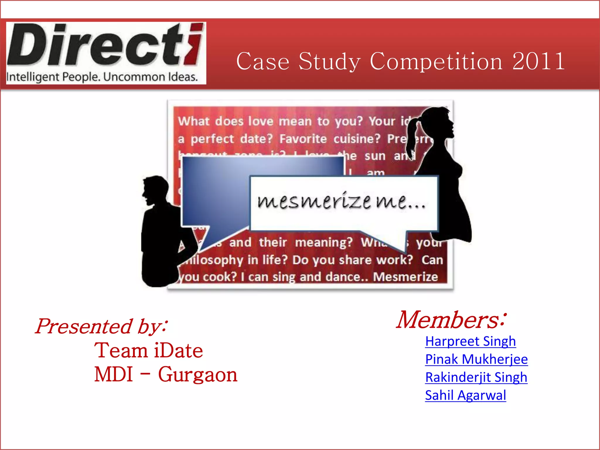 The document outlines a case study competition presentation for an online dating website called "Mesmerize Me" that targets young, educated, urban Indians who are active online. It discusses the growing online dating industry in India and the target audience for the site. Key features of Mesmerize Me outlined include ways for users to initiate conversations and connect through humor, ensuring credibility of users, and matching users based on personality traits.