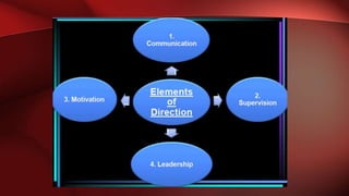 3. Effective directing requires following principles like maximizing individual contribution, achieving harmony between individual and organizational objectives, having a clear line of command, using appropriate direction techniques for different subordinates, effective communication, leveraging informal groups, demonstrating good leadership, and ensuring follow through.