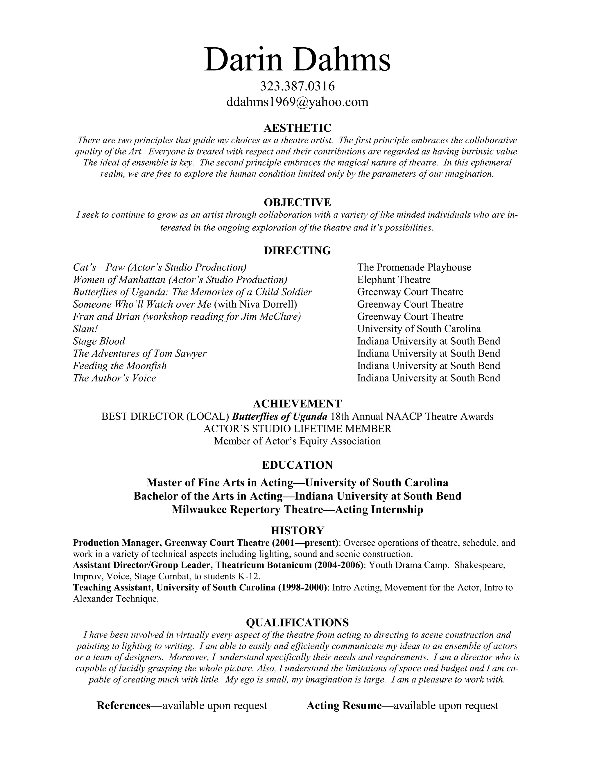 Darin Dahms seeks to continue growing as a theatre artist through collaboration. He has over 20 years of experience in various theatre roles including directing, production management, teaching, and acting. His guiding principles embrace collaboration and exploring the human condition through imagination. He has a Master of Fine Arts in Acting and directs, acts, and teaches across various theatres.