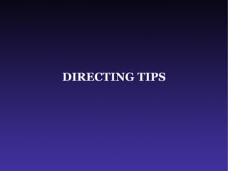The document provides tips for directing at various stages of film production. It emphasizes the importance of thorough preproduction planning, getting good audio during production, and editing to tell the story effectively in post-production. Key elements discussed include breaking down scripts visually and by shot, using a director's binder to stay organized, focusing actors with action verbs and imagery, and creating dynamic blocking and camera movements. Backups are also strongly recommended.