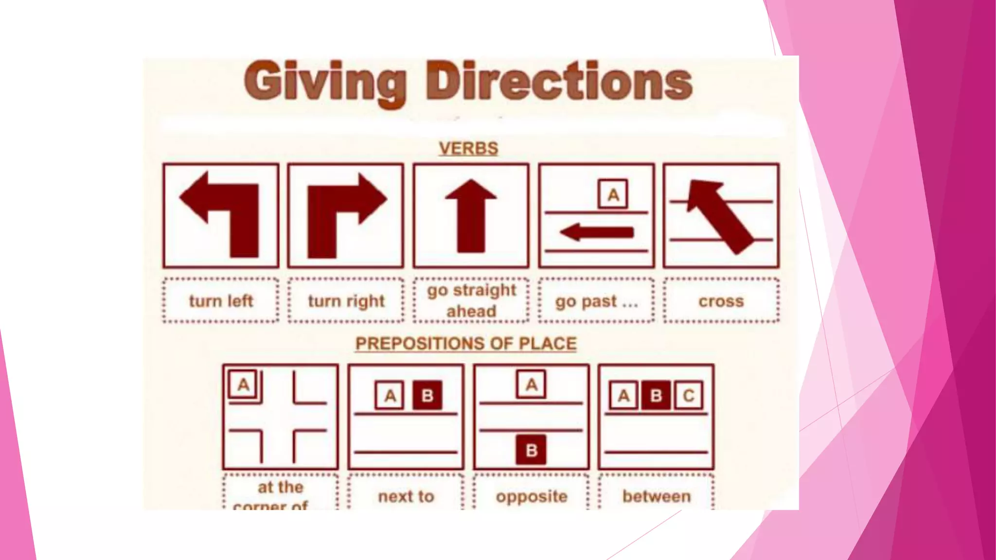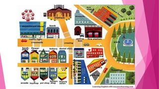 This document contains phrases and examples for asking for and giving directions in Indonesian. It includes questions like "how do I get to...", "where is...", "is this the right way...", and responses like "go straight until...", "turn left/right...", "it's across from...", and "take the second road on the right...". It then provides an example dialogue in Indonesian of someone asking for directions to a national bank and receiving step-by-step instructions.
