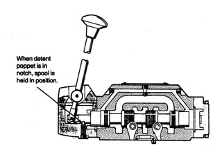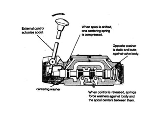 This document describes different types of valves including a manually actuated three-position valve, a four-way two-position valve, and a spring-centered three-position valve. It also discusses a typical solenoid controlled, pilot operated or two-stage valve where the pilot choke is mounted on the valve.