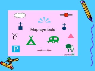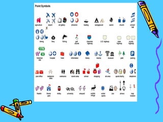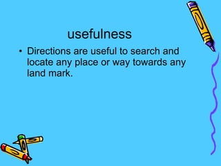 The document discusses cardinal directions (North, South, East, West), intermediate directions (Northeast, Southeast, Southwest, Northwest), and symbols used on maps. Maps use symbols like dots, lines, triangles, and colors to represent places like gas stations, restaurants, hotels, and religious sites to help people locate and navigate to different locations.