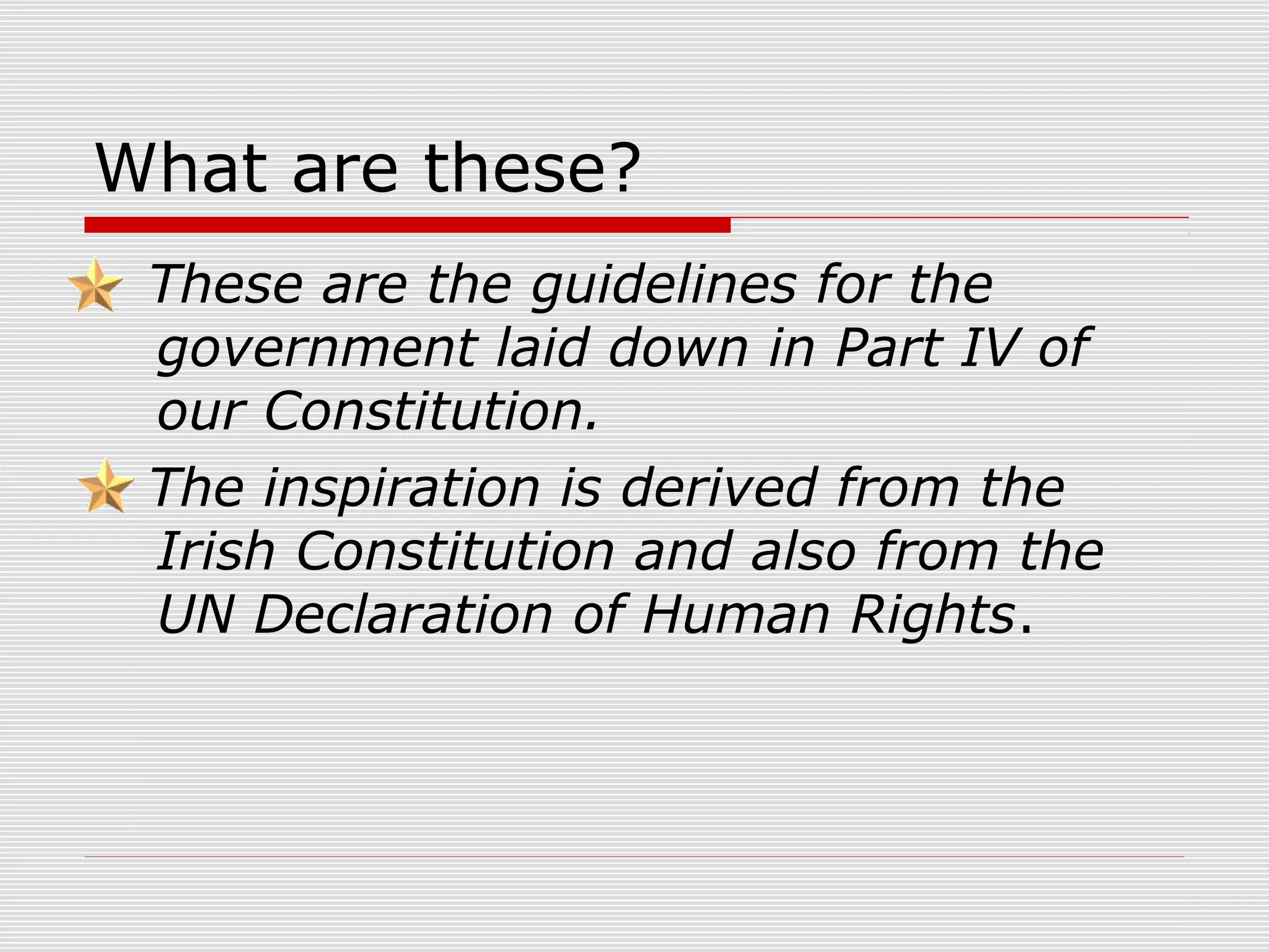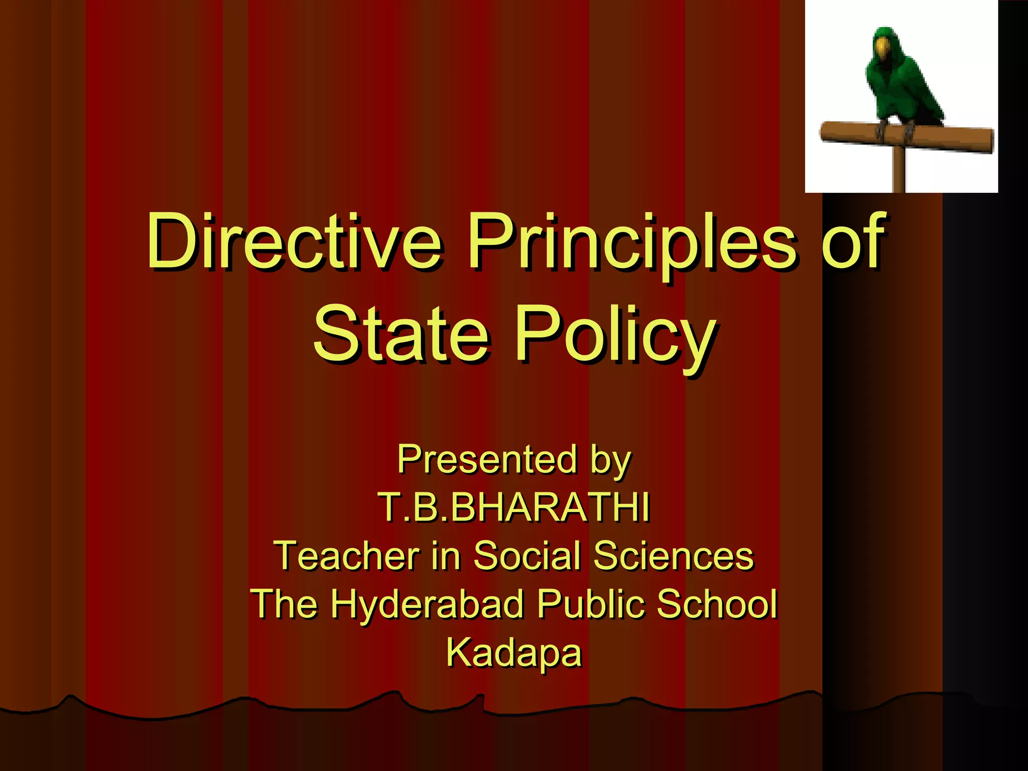The Directive Principles of State Policy are guidelines for the government laid down in Part IV of the Indian Constitution. They were inspired by the Irish Constitution and UN Declaration of Human Rights. The principles are non-justiciable rights that are fundamental for governance. They include Gandhian Principles promoting education, employment and health, Social and Economic Principles ensuring livelihood and equality, and General Principles protecting the environment and international relations. While they are not enforceable in courts, the principles highlight national objectives and prescribe that national resources should benefit all.