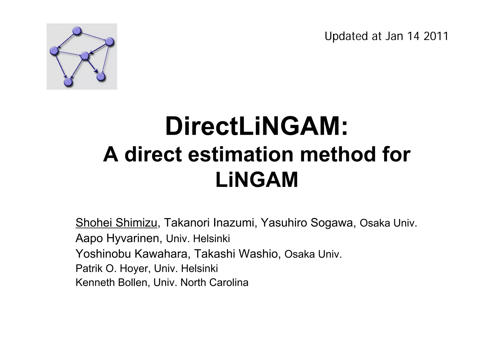 DirectLiNGAM is a new non-Gaussian estimation method for the LiNGAM model that directly estimates the variable ordering without using ICA. It iteratively identifies exogenous variables using independence tests between each variable and its residuals from regression on other variables. This allows it to estimate the ordering in a fixed number of steps, with no algorithmic parameters, convergence issues, or scale dependence like previous ICA-based methods. It was shown to estimate the correct causal ordering on a real-world socioeconomic dataset, matching domain knowledge better than alternative methods like ICA-LiNGAM, PC algorithm, and GES.