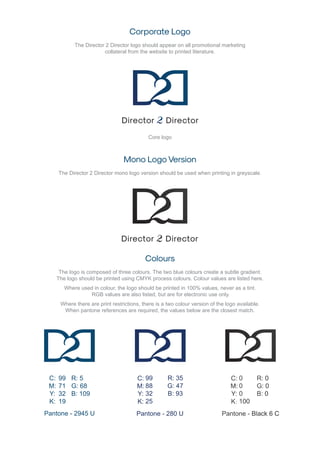 These guidelines outline the proper use of the Director 2 Director corporate logo. The logo should appear on all marketing materials and be printed in the specified color values. There is a minimum size of 30mm wide for the full logo and 15mm for the acronym. The logo must have a clear space around it and not be modified, separated, or placed at an angle. It should only be used horizontally on white or pale backgrounds.