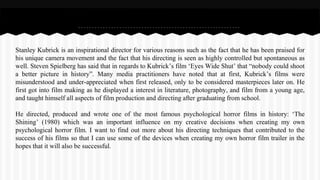 Stanley Kubrick is praised as an influential director for his unique camera movements and highly controlled yet spontaneous directing style. His films were initially misunderstood but are now considered masterpieces. He taught himself film production and directing. One of his most famous films, The Shining, was a major influence on the document's author and informed their creative decisions for their own psychological horror film. The document discusses Kubrick's directing techniques on The Shining, including using the Steadicam to its fullest potential and custom zoom lenses, that contributed to the film's success and left a lasting legacy.