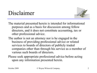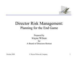 The document discusses risk management strategies for directors of public companies, emphasizing the importance of assessing various risks such as strategic, compliance, and reputational risks. It highlights the necessity of adequate processes and documentation in decision-making, as well as the significance of proper indemnification agreements and directors and officers (D&O) insurance. The author offers personal guidelines for screening board opportunities and stresses the importance of diligence and engagement once serving on a board.