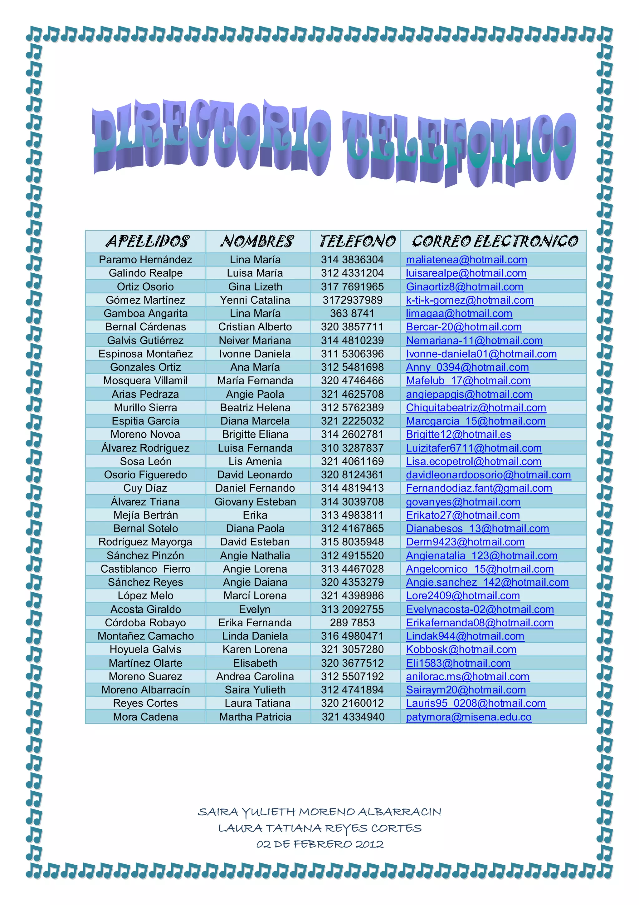 This document contains a list of 30 names, phone numbers, and email addresses. It includes information such as last names, first names, phone numbers, and email addresses for each contact. At the bottom is a signature from Saira Yulieth Moreno Albarracin and Laura Tatiana Reyes Cortes dated February 2, 2012.