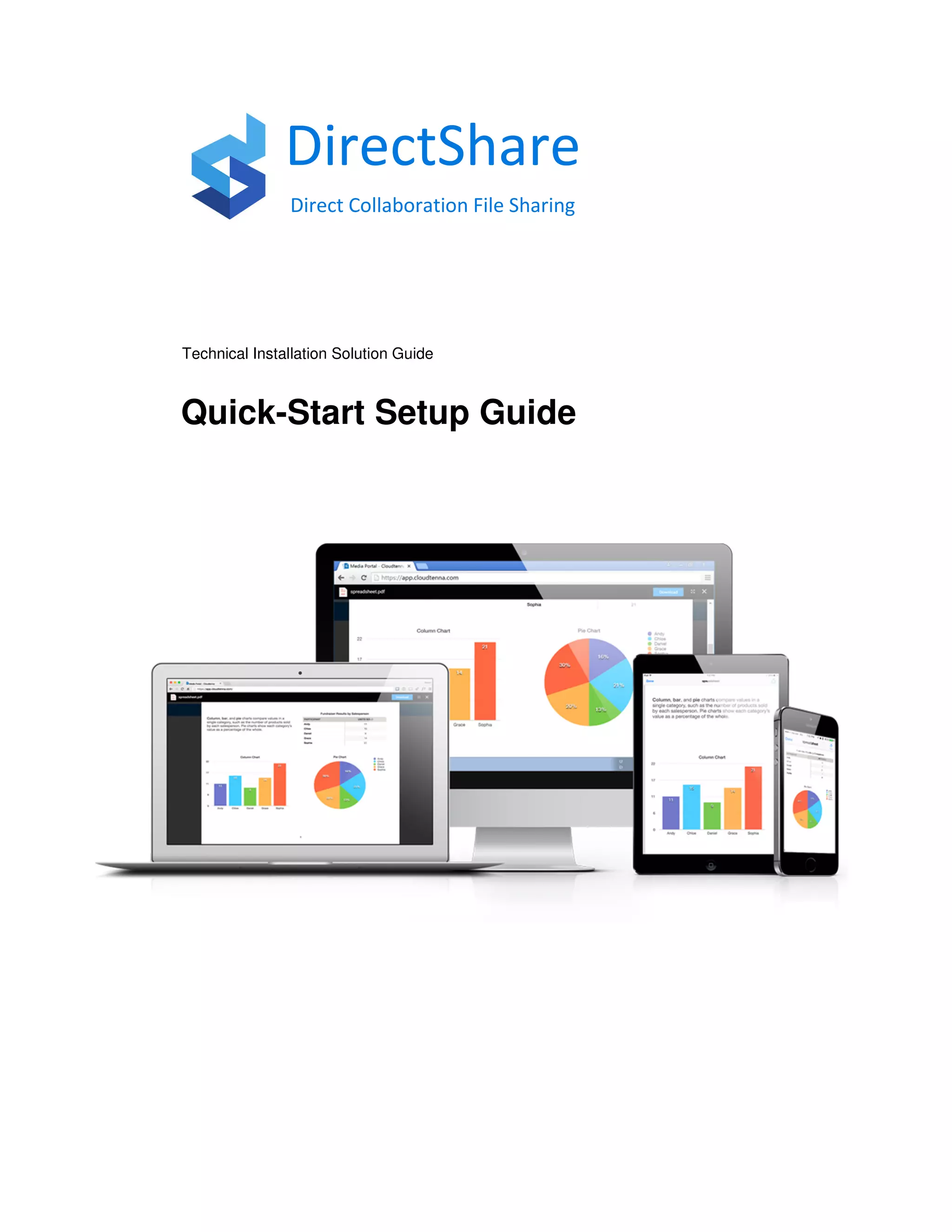 This document provides a quick-start guide for installing and configuring Cloudtenna DirectShare, a file sharing and collaboration solution. It outlines the necessary pre-installation information, steps for deploying the DirectShare virtual appliance using VMware ESXi, and configuring the appliance through its GUI to integrate with Active Directory, set up file shares, and enable guest access and shared links. The guide is intended to help users get DirectShare set up and operational in their environment for secure external file sharing and collaboration.