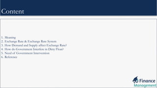 A dirty float is an exchange rate system where a currency's value is influenced by both market demand and government intervention. The document explains how exchange rates are determined and how government actions can stabilize currency values during economic distress. It highlights the significance of understanding demand and supply dynamics in relation to currency valuation.