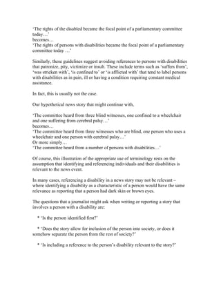 This document provides guidelines for using respectful and affirmative language when referring to people with disabilities. It recommends putting the person before the disability, such as "person with a disability" rather than "disabled person". It advises avoiding terms that imply the person is defined by their disability or that disability is something from which they suffer. Examples of problematic terms to avoid include "victim", "confined to a wheelchair", or "suffering from a disability". The guidelines also note that a person's disability may not always be relevant to mention and journalists should consider if including it separates or includes the person in society.