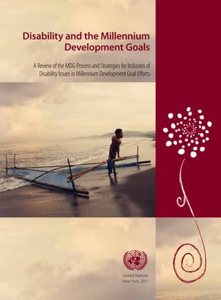 This document reviews strategies for including disability issues in the Millennium Development Goals. It summarizes the MDG process and examines how the goals, targets, and indicators relate to disability concerns. It identifies entry points for integrating disability considerations, such as data collection and monitoring frameworks. The conclusion discusses next steps, emphasizing the need to mainstream disability in post-2015 development policies to help reduce poverty among persons with disabilities.
